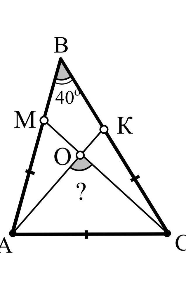 На сторонах АВ и ВС треугольника ABC отметили точки М и К так, что МА = АС=СК. Отрезки АК и СМ пересекаются в точке О. Найдите угол АОС, если угол АВС равен 40°