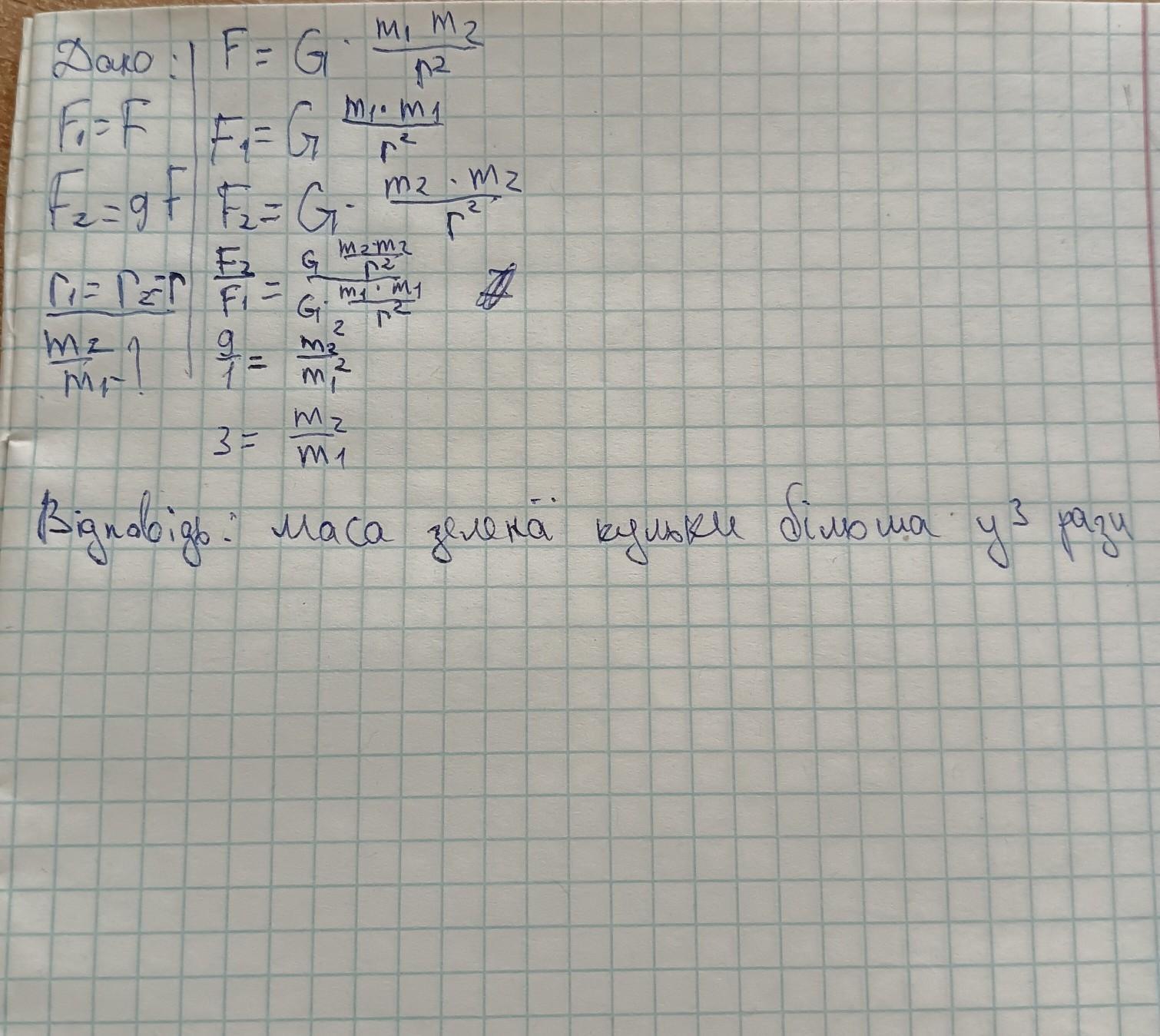 4. Дві червоні кулі однаковоï маси притягаються з силою F, а дві зелені кулi однакової маси, що знаходяться на такій самій відстані одна від одноï, притягаються із силою 9F. У скільки разів маса зеленої кулі бiльша за масу червоноï?