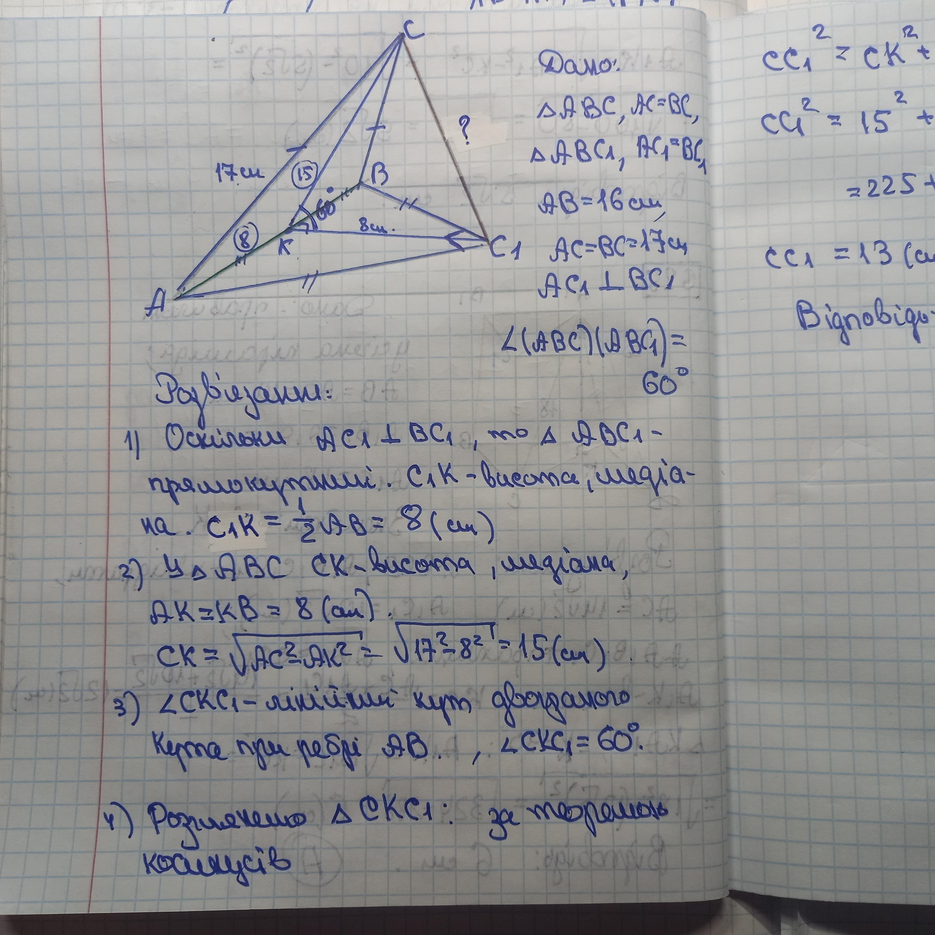 Два рівнобедрених трикутники мають спільну основу, а їх площини утворюють кут 60°. Спільна основа дорівнює 16 см, бічна сторона одного трикутника дорівнює 17 см, а бічні сторони другого трикутника взаємно перпендикулярні. Обчислити відстань між вер- шинами трикутника