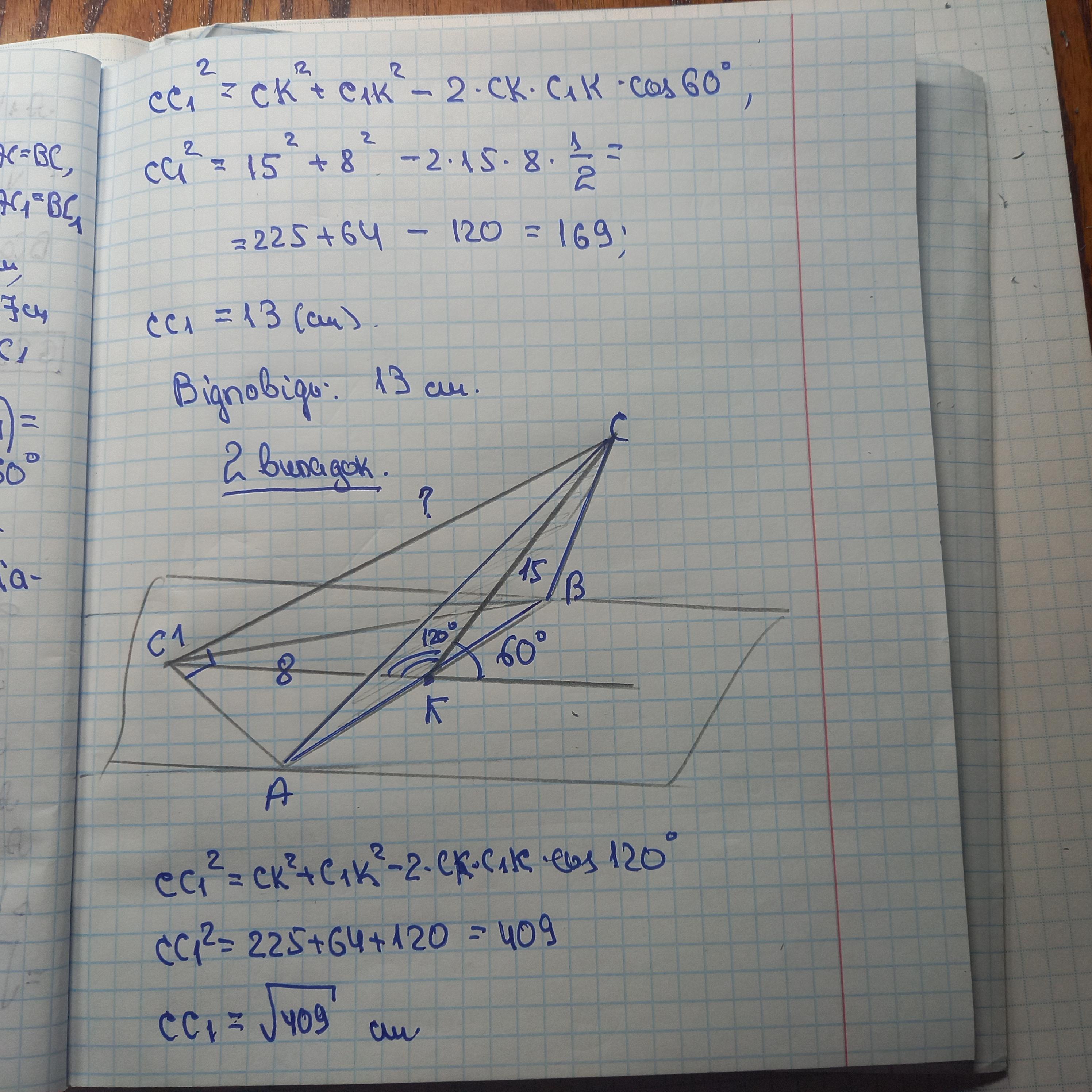 = √( 15² + 8² - 2*15*8* cos60°) = √( 225 + 64 -60 * 1/2 ) =√169 = 13 (см ).