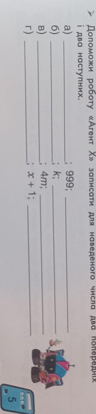 Допоможи роботу > записати для наведеного числа два попередніх і два наступних. a) 6) B) г) ;999; ; k; ; 4m; ;x + 1; 5