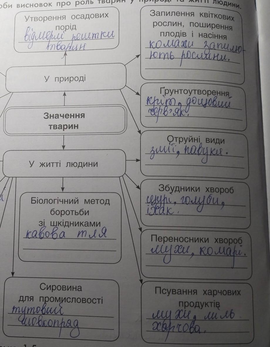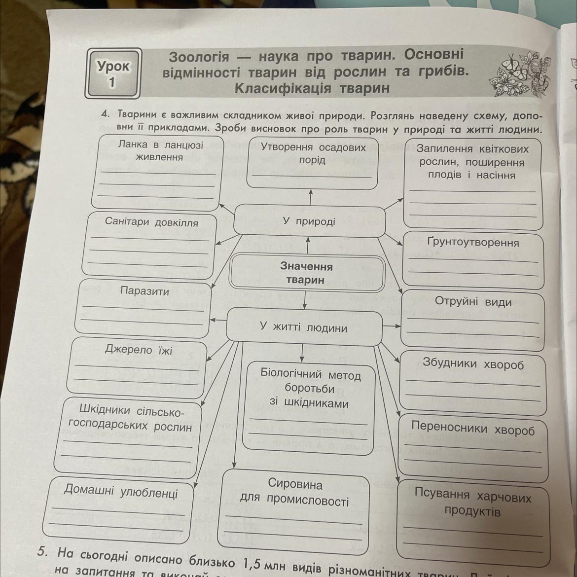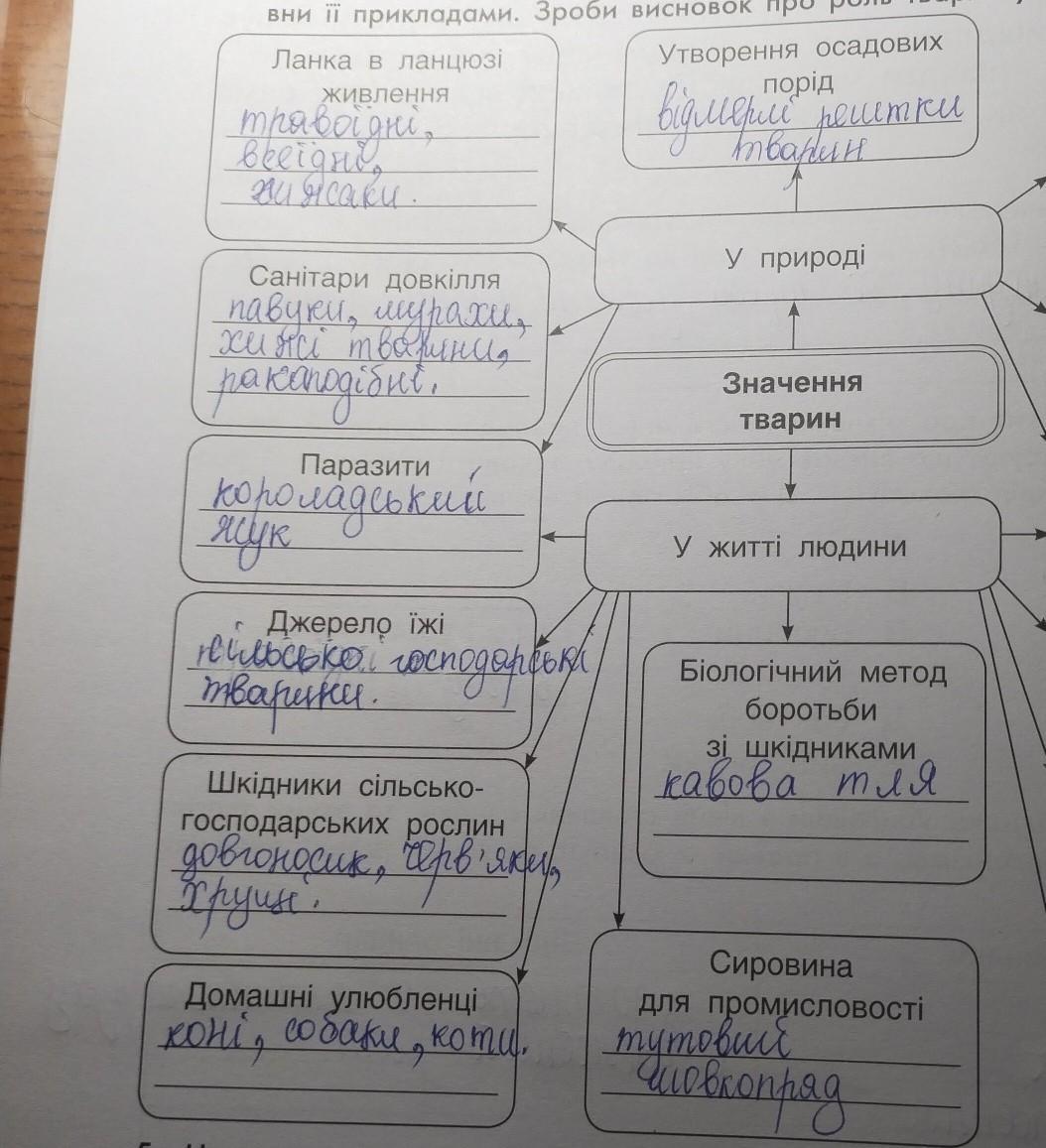 4. Тварини є важливим складником живої природи. Розглянь наведену схему, доповни її прикладами. Зроби висновок про роль тварин у природі та житті людини