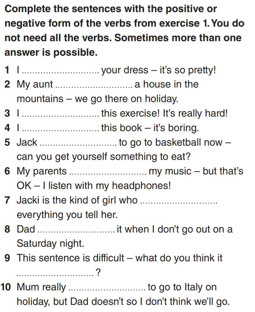 Sure, here are the sentences with the missing verbs filled in:I love your dress - it's so pretty!My aunt has a house in the mountains; we go there on holiday.I hate this exercise! It's really hard!I find this book boring.I want to go to basketball now.My parents don't like my music. OK - I listen with my headphones! - but that's fine.Jacki is the kind of girl who listens to everything you tell her.Dad enjoys it when I don't go out on a Saturday night.This sentence is difficult - what do you think it means?Mum really wants to go to Italy on holiday, but Dad doesn't, so I don't think we'll go.