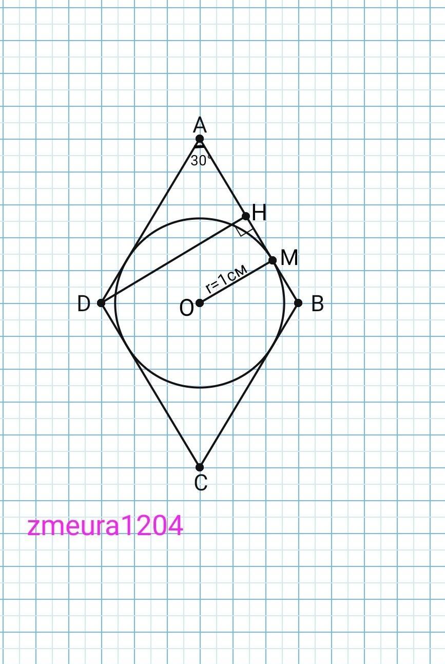 Гострий кут ромба дорівнює 30 градусів, а радіус вписаного у нього кола 1см. Знайти площу ромба. Срочно