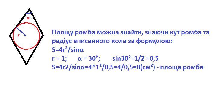 S=4r²/sinα=4*1²/0,5=4/0,5=8(см²) - площа ромба