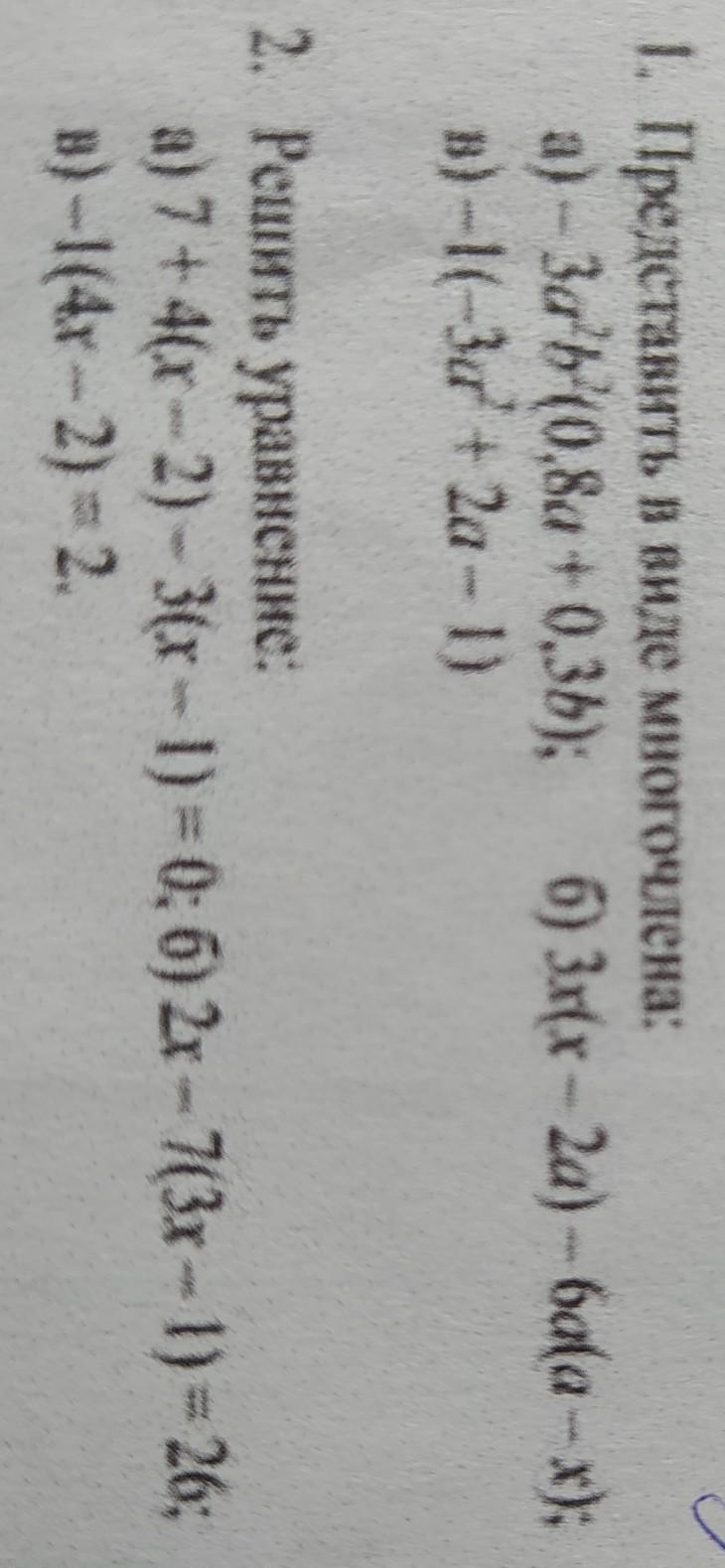 Доз 1. Представить в виде многочлена: a) - 3a²b (0,80+ 0,36); 6) 3x(x-2a) - ba(a-x); B)-1(-3a² + 2a-1) Вариант № 2 2. Решить уравнение: a) 7+4(x-2)-3(x-1)=0; 6) 2x - 7(3x-1)=26; B)-1(4x-2) = 2.