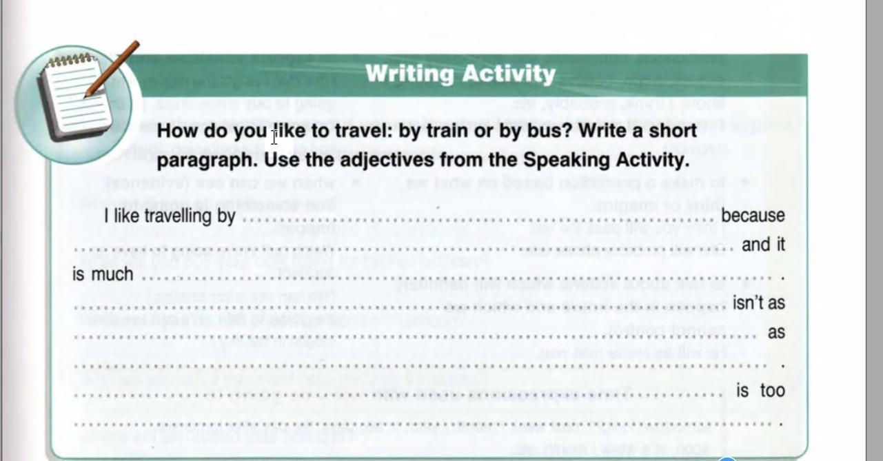 I prefer to travel by train rather than by bus. Trains are usually more comfortable and spacious. You can move around, visit the dining car, and enjoy the scenery from large windows. It feels more relaxed and less crowded compared to a bus. Overall, I find train journeys more enjoyable and convenient.