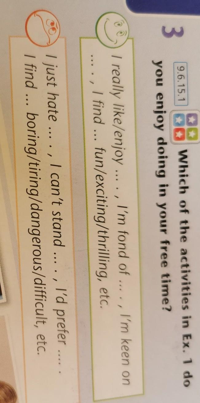 3 9.6.15.1 Which of the activities in Ex. 1 do you enjoy doing in your free time? I really like/enjoy ... . , I'm fond of ... . , I'm keen on ... . , I find ... fun/exciting/thrilling, etc. I just hate ...., I can't stand ... . , I'd prefer ..... I find... boring/tiring/dangerous/difficult, etc.