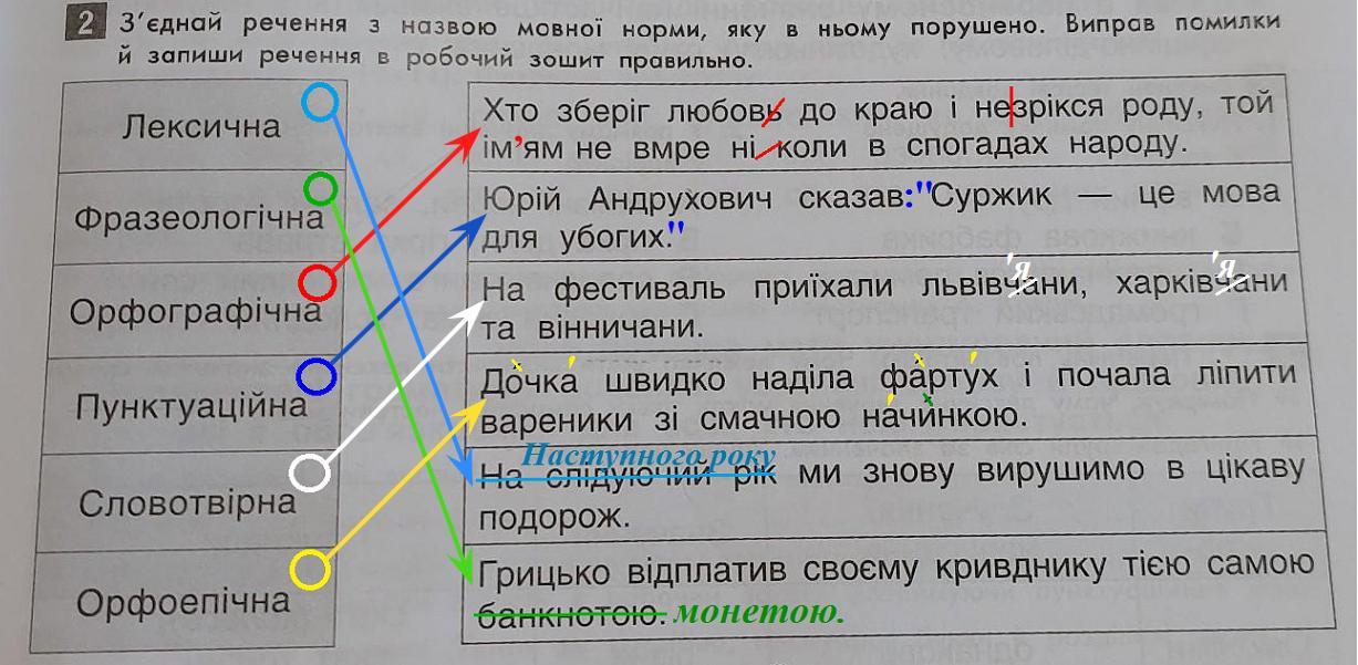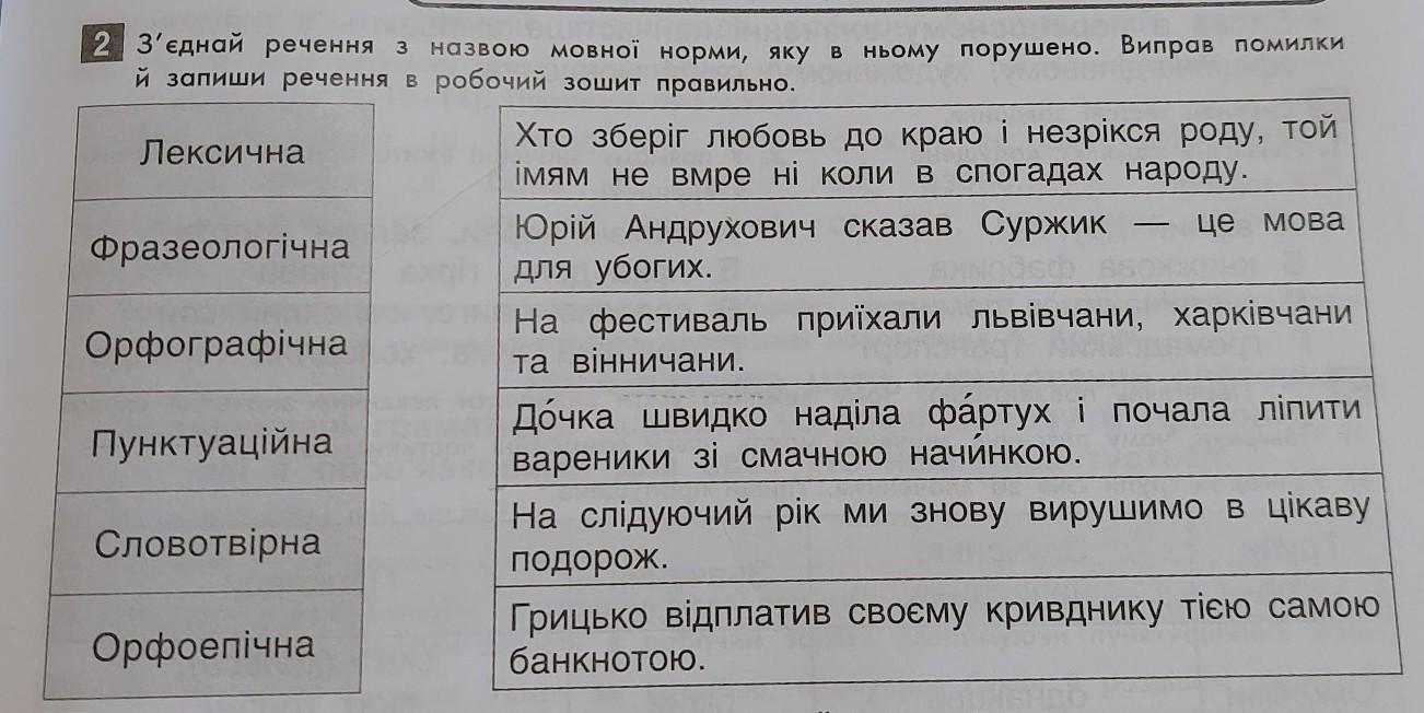 2 3'єднай речення з назвою мовної норми, яку в ньому порушено. Виправ помилки й запиши речення в робочий зошит правильно. Лексична Фразеологічна Орфографічна Пунктуаційна Словотвірна Орфоепічна Хто зберіг любовь до краю і незрікся роду, той імям не вмре ні коли в спогадах народу. це мова Юрій Андрухович сказав Суржик для убогих. На фестиваль приїхали львівчани, харківчани та вінничани. Дочка швидко наділа фартух і почала ліпити вареники зі смачною начинкою. На слідуючий рік ми знову вирушимо в цікаву подорож. Грицько відплатив своєму кривднику тією самою банкнотою.