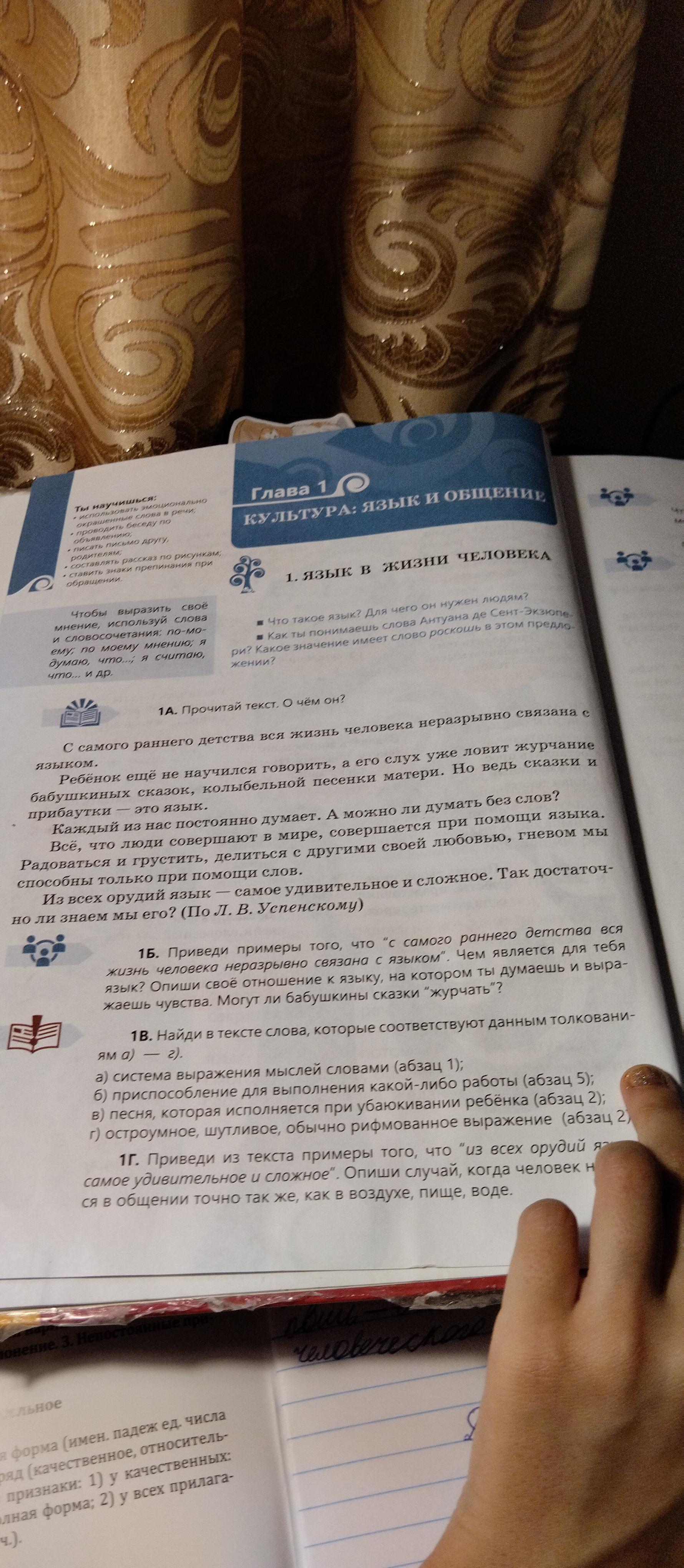 1Б. Диалог с малышом , чтение ему рассказов и сказок . Для меня знание языка , является средством разговора с другими людьми . Я разговариваю на языке и думаю на нем и мне это нравиться , то что я могу выпадать эмоции на нем и свои мысли.