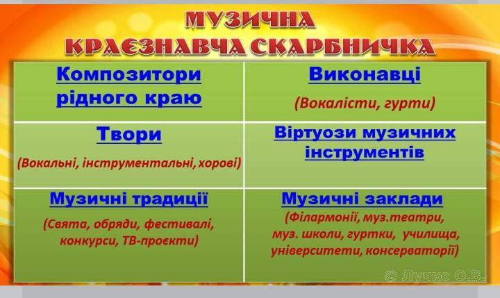 (Наповніть Музичну Краєзнавчу Скарбничку прізвищами видатних композиторів України, назвами улюблених гуртів, назвами музичних закладів які є в Україні, музичними традиціями (музичні конкурси, свята). Використовуйте на допомогу інтернет-пошук.)