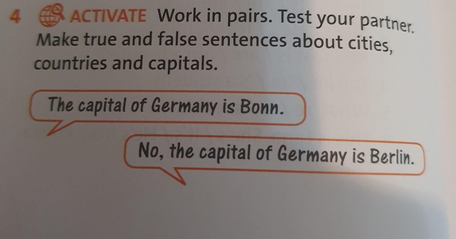 4 ACTIVATE Work in pairs. Test your partner. Make true and false sentences about cities, countries and capitals. "The capital of Germany is Bonn." "No, the capital of Germany is Berlin." помогите придумать вопросы