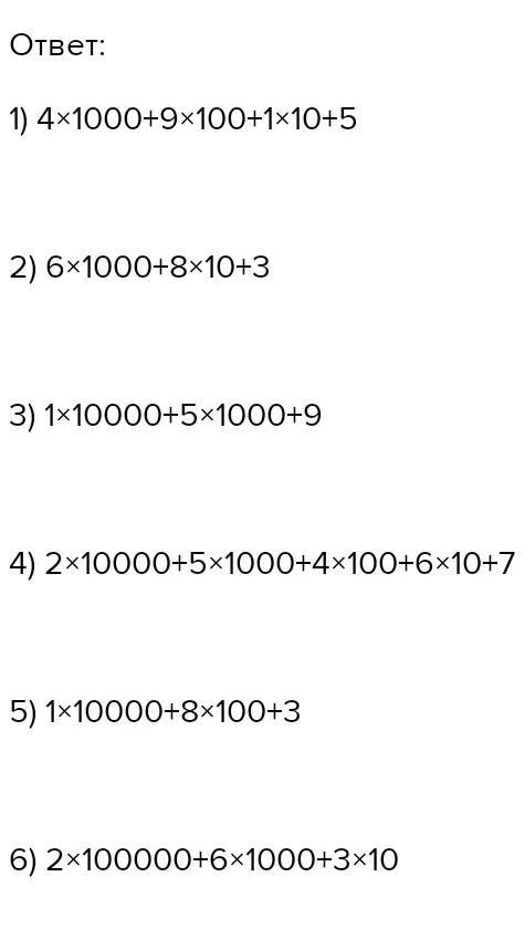 число. 9. 1) Запишите числа в виде суммы разрядных слагаемых двумя 1 способами: 1) 4 915; 2) 6 083; 3) 15 009; 5) 10 803; 4) 25 467; 6) 206 030. Образец: 9746 = 9000 + 700 + 40 +6; 9746 = 9 - 1000 + 7 - 100 + +4.10+ 6. 10 Испо
