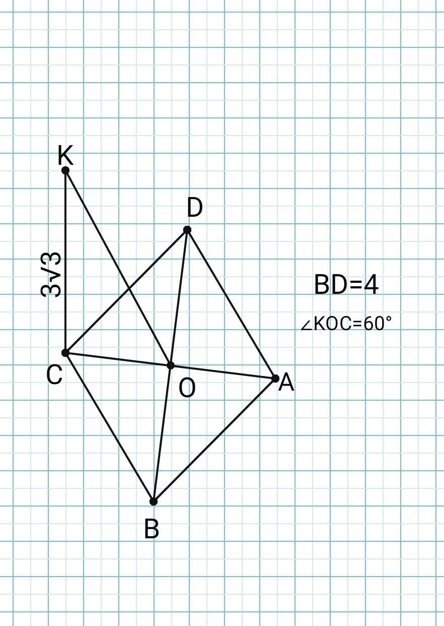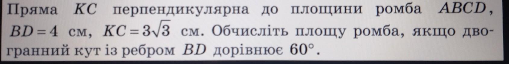 Пряма КС перпендикулярна до площини ромба ABCD, BD=4 см, КС=3√3 см. Обчисліть площу ромба, якщо дво гранний кут із ребром BD дорівнює 60°.