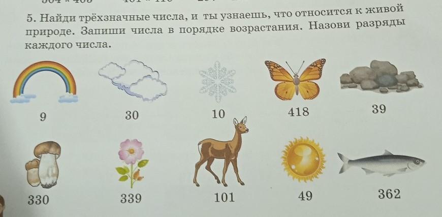 5. Найди трёхзначные числа, и ты узнаешь, что относится к живой природе. Запиши числа в порядке возрастания. Назови разряды каждого числа. 9 330 30 339 10 101 418 49 39 362