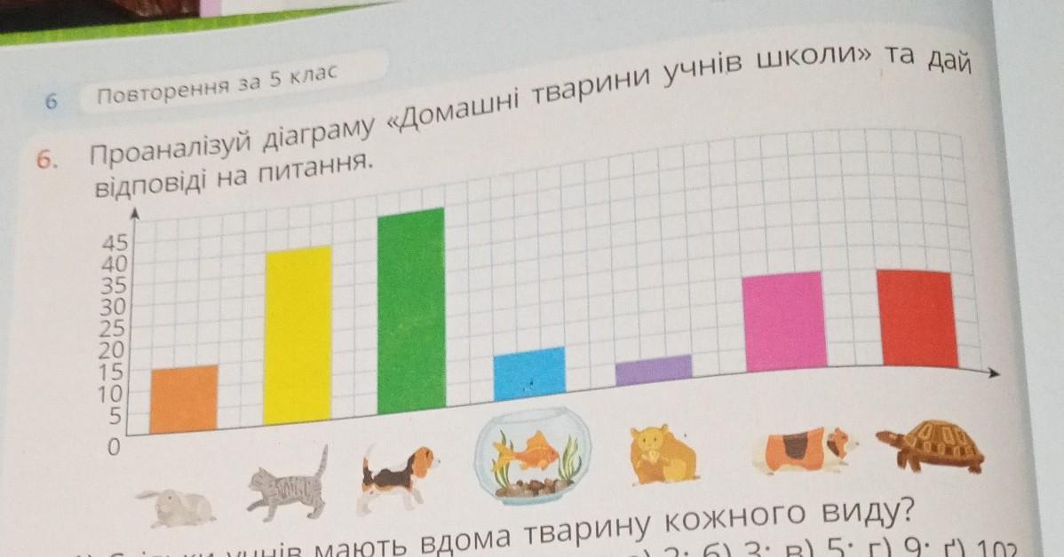 Повторения за 5 клас 6. Проаналізуй діаграму «Домашні тварини учнів школи>> та дай відповіді на питання. 1) Скільки учнiв мають вдома тварину кожного виду? 2) кiлькiсть яких тварин ділиться на: а) 2; б) 3; в) 5; г) 9; г) 102 3) Чи є кiлькiсть власникiв кроликів складеним числом? 4) Знайди кiлькiсть власникiв собак і кішок разом. Чи це число ділиться на: а) 2; 6) 5; в) 10? 5) Порівняй кiлькiсть власників хом'якiв, рибок та кроликів разом iз кiлькiстю власників собак. 6) Скільки всього дітей опитали? 7) Розклади на простi множники число власників: а) кроликів; б) котів; в) собак. ( ОЧЕНЬ НАДО 2) )