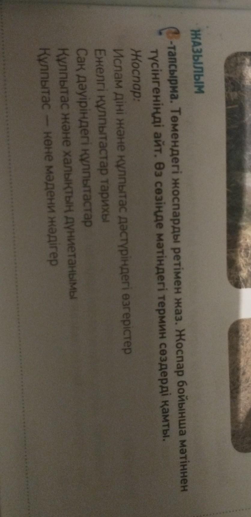ЖАЗЫЛЫМ 8-тапсырма. Төмендегі жоспарды ретімен жаз. Жоспар бойынша мәтіннен түсінгеніңді айт. Өз сөзіңде мәтіндегі термин сөздерді қамты. Жоспар: Ислам діні және кұлпытас дәстүріндегі өзгерістер Ежелгi құлпытастар тарихы Сақ дәуіріндегі кұлпытастар Құлпытас және халықтың дүниетанымы Кулпытас көне мәдени жәдігер -