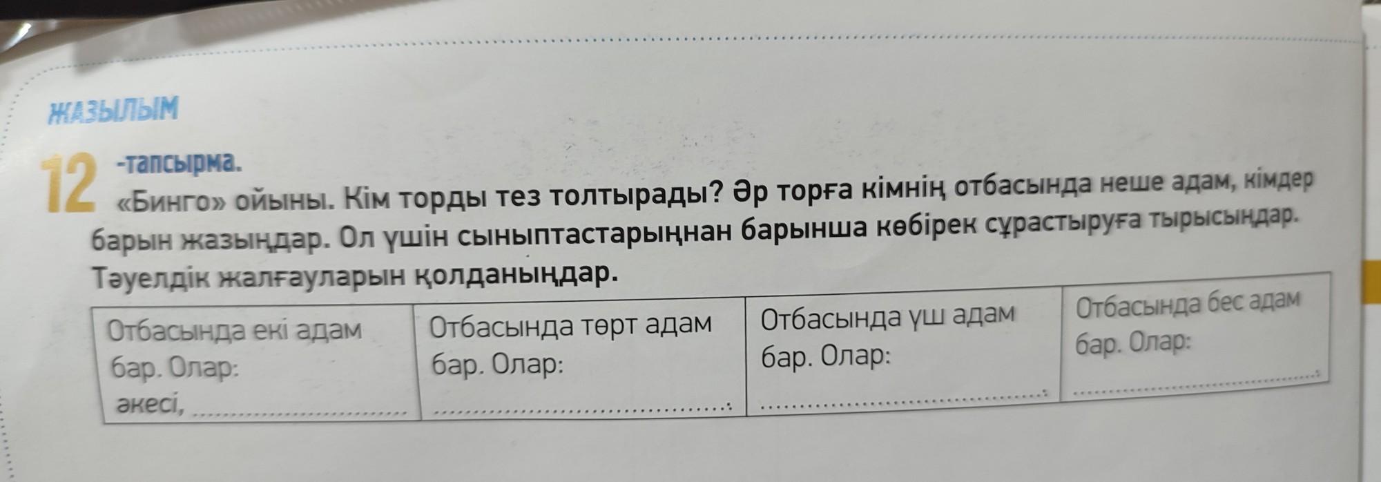 ******** Отбасында екі адам бар. Олар: әкесі, МАЗЫЛЫМ -тапсырма. 12 «Бинго» ойыны. Кiм торды тез толтырады? Ор торға кiмнiң отбасында неше адам, кімдер барын жазыңдар. Ол үшiн сыныптастарыннан барынша кобiрек сурастыруға тырысындар. Тәуелдік жалғауларын қолданыңдар. *********** Отбасында торт адам бар. Олар: Отбасында үш адам бар. Олар: Отбасында бес адам бар. Олар: