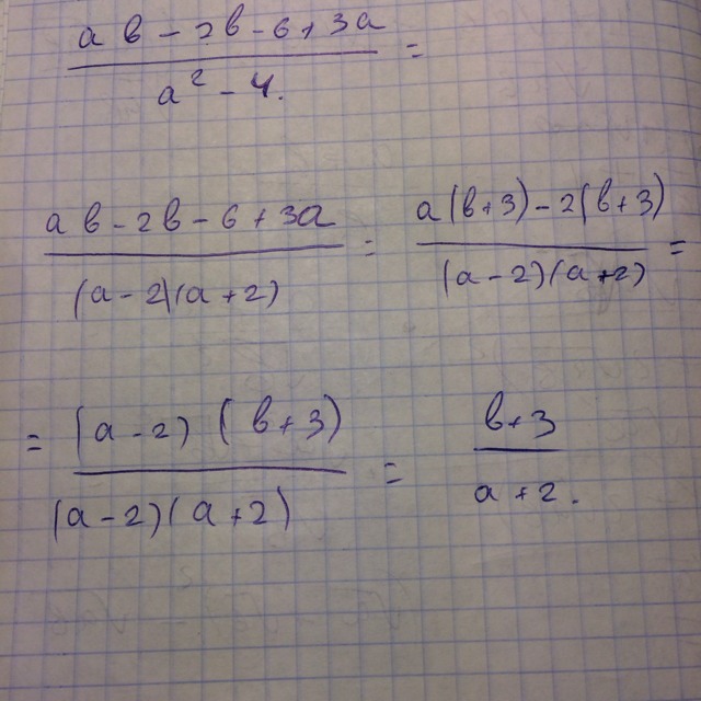 (ab-2b-6+3a)/a^2-4=(b(a-2)-3(2-a))/(a-2)(a+2)=(b(a-2)+3(a-2))/(a-2)(a+2)=(b+3)(a-2)/(a-2)(a+2)=