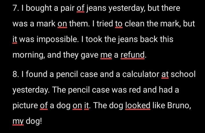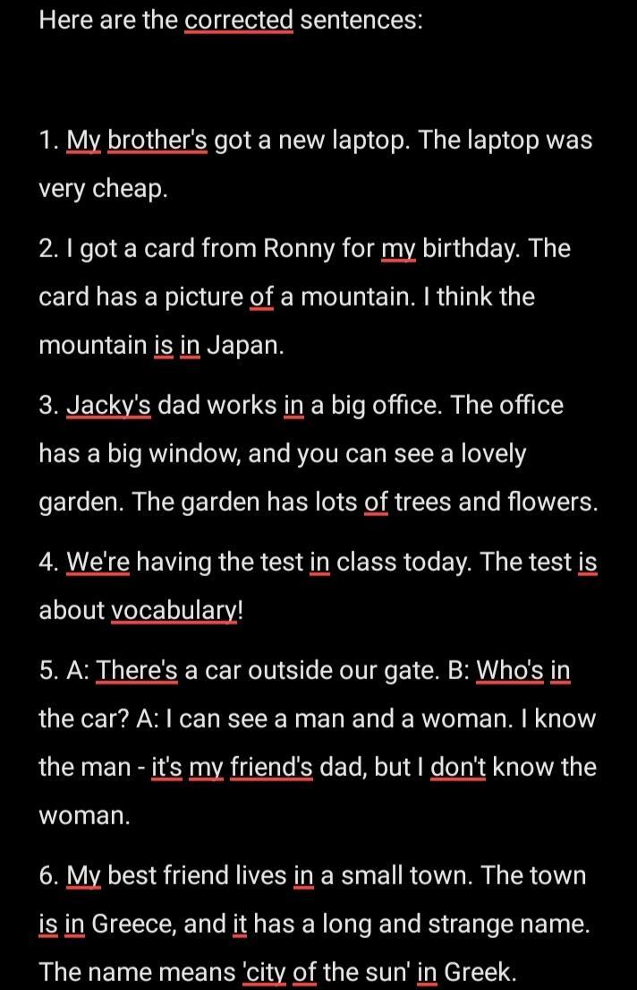 Find and correct the mistakes in the sentences, 1 My brother's got a new laptop. A laptop was very cheap. The laptop was very cheap. 2 I got a card from Ronny for my birthday. The card has a picture of the mountain. I think the mountain is in Japan. 3 Jacky's dad works in a big office. An office has a big window and you can see a lovely garden. The garden has lots of trees and flowers. 4 We're having the test in class today. The test is about vocabulary! 5 A: There's a car outside our gate. B: Who's in the car? A: I can see a man and a woman. I know the man - it's my friend's dad but I don't know a woman. 6 My best friend lives in a small town. The town is in Greece and it has the long and strange name. The name means 'city of the sun' in Greek. 7 I bought a pair of jeans yesterday but there was a mark on them. I tried to clean a mark but it was impossible. I took the jeans back this morning and they gave me a refund. 8 I found a pencil case and the calculator at school yesterday. The pencil case was red and it had a picture of a dog on it. The dog looked like Bruno, my dog!