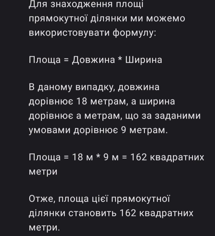 знайдіть площу прямокутної ділянки довжиною 18 м якщо ширина менша а метрів. (а=9)