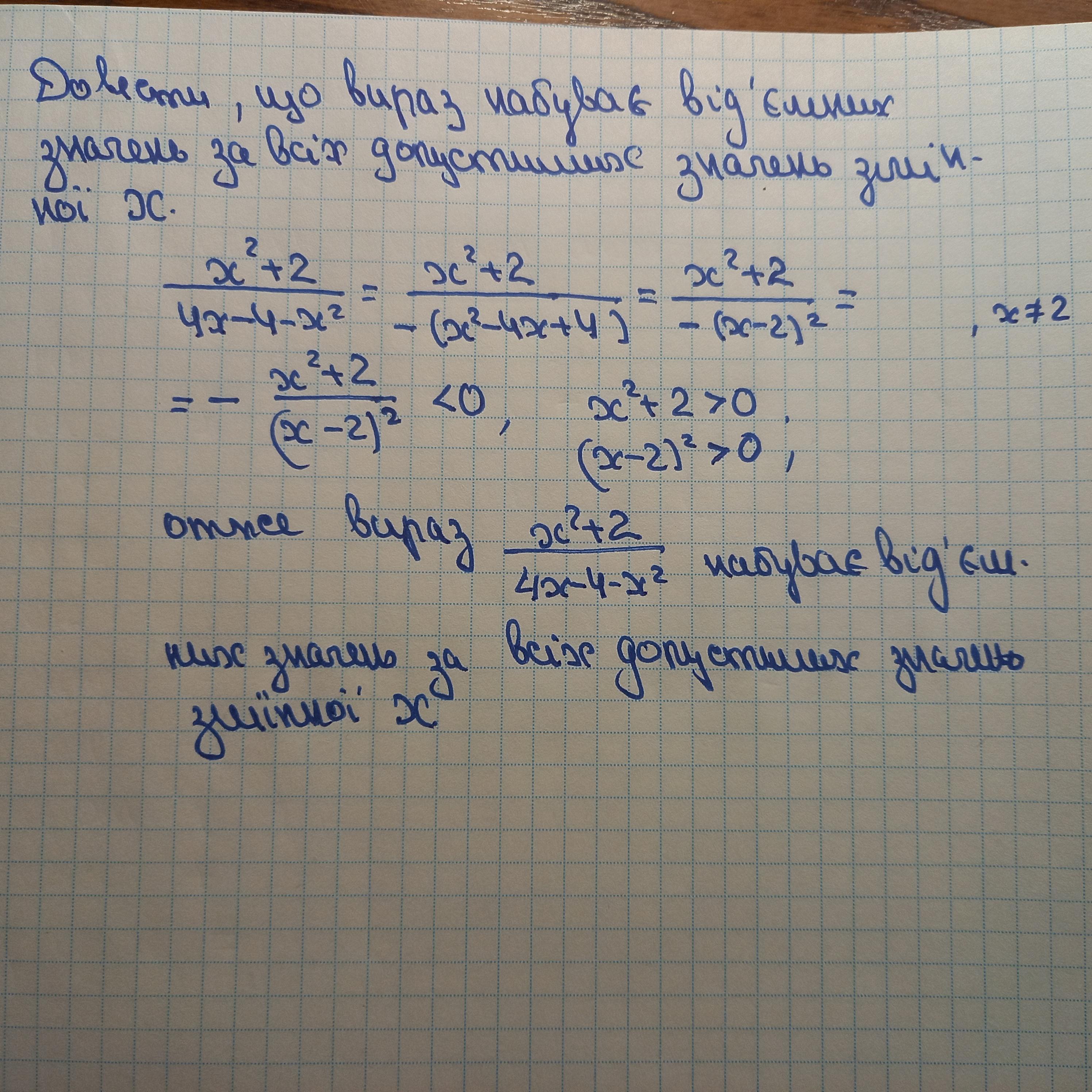 2. Доведіть, що вираз вiд'ємних значень. х² +2 /4x-4-x² за всiх допустимих значень змiнноï х набуває