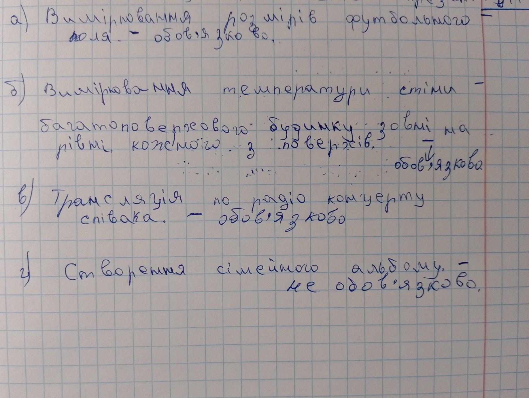 3. Визначте пристрої для виконання нижченаведених зав- дань. Укажіть, чи обов'язково вони повинні бути цифровими. Результати виконання завдань запишіть у зошит. Завдання: а) Вимірювання розмiрiв футбольного поля. б) Вимірювання температури стіни багатоповерхового будинку зовнi на рiвнi кожного з поверхів. в) Трансляція по радіо концерту співака. г) Створення сімейного фотоальбому.