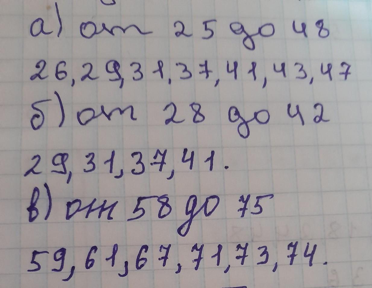 Найдите среди данных чисел взаимно простые. а) от 25 до 48 b) от 28 до 42 c) от 58 до 75