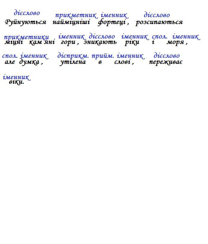 5)Руйнуються найміцніші фортеці розсипаються міцні кам’яні гори зникають ріки і моря але думка утілена в слові переживає віки.