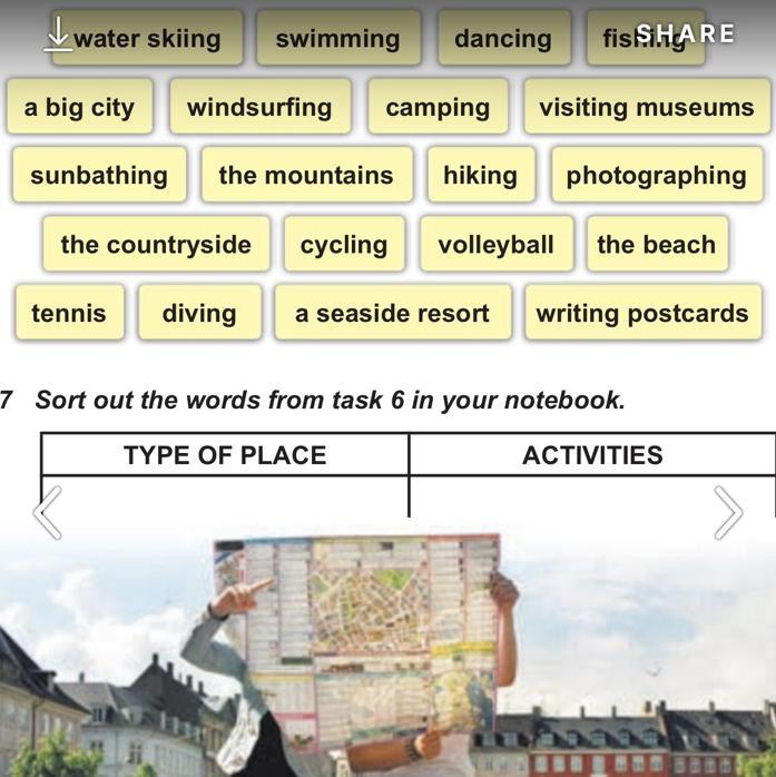 Type of place: a big city, the beach , cycling , water skiing , the mountain ⛰, hiking. я помогла =>
