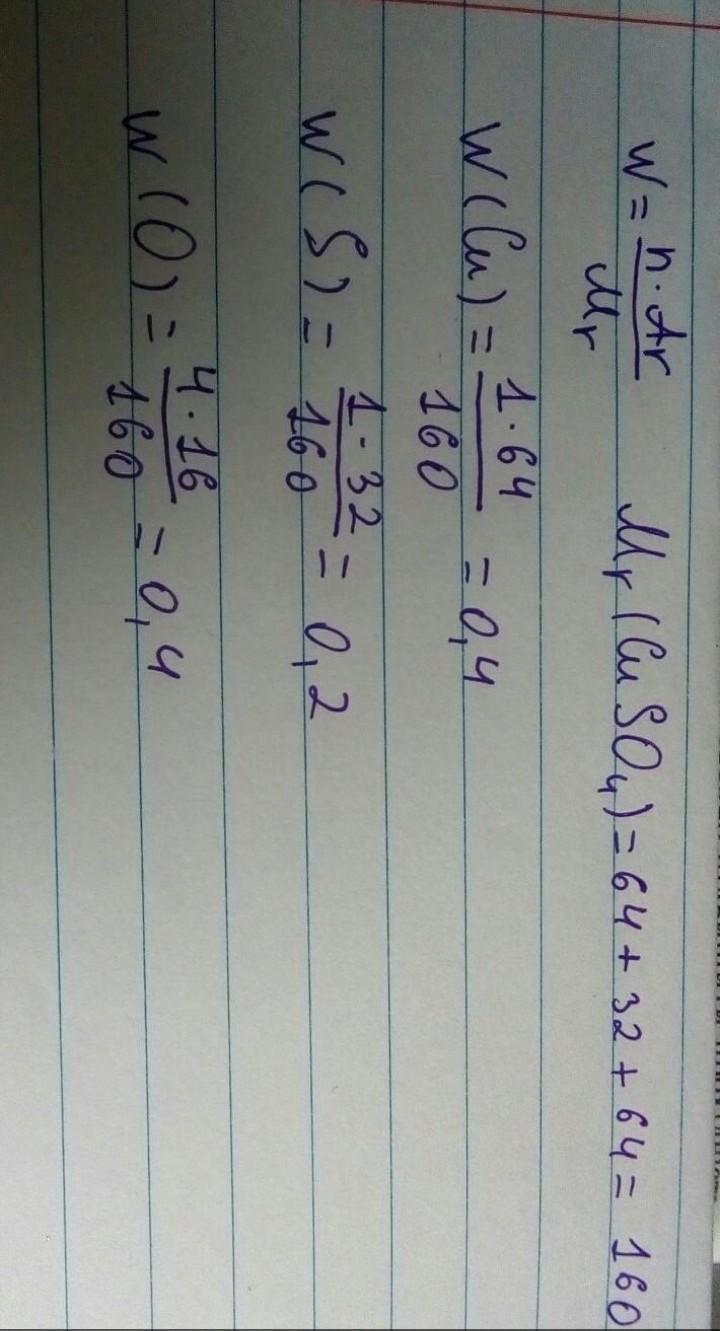 2) ω(Cu) = N(Cu) * Ar(Cu) * 100% / Mr(CuSO4) = 1 * 64 * 100% / 160 = 40%.