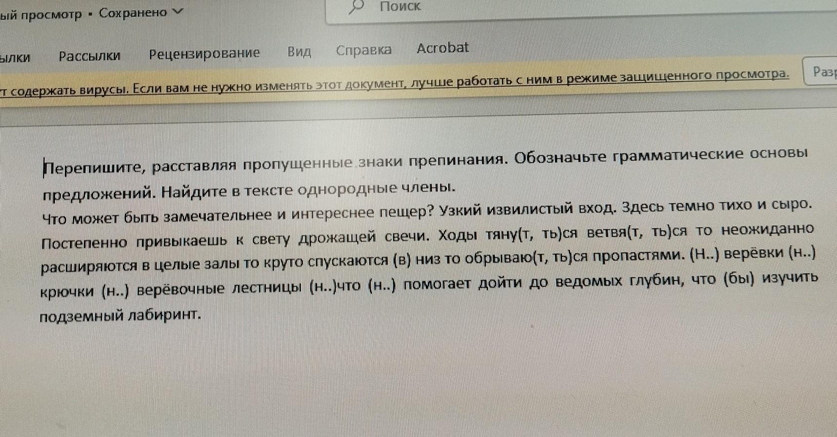 (1)—Что— =может быть= замечательнее= и =интереснее= пещер? (2)Узкий извилистый —вход—. (3)Здесь =темно=, =тихо= и =сыро=. Постепенно =привыкаешь= к свету дрожащей свечи. (4)—Ходы— =тянутся=, =ветвятся=, то неожиданно =расширяются= в целые залы, то круто =спускаются= вниз, то =обрываются= пропастями. (5) Ни