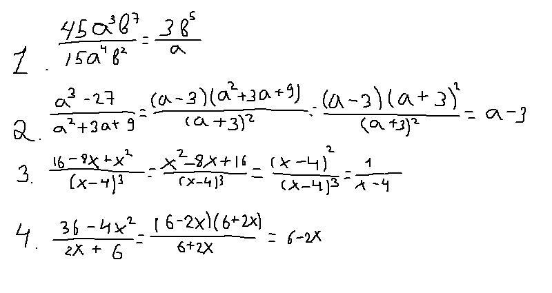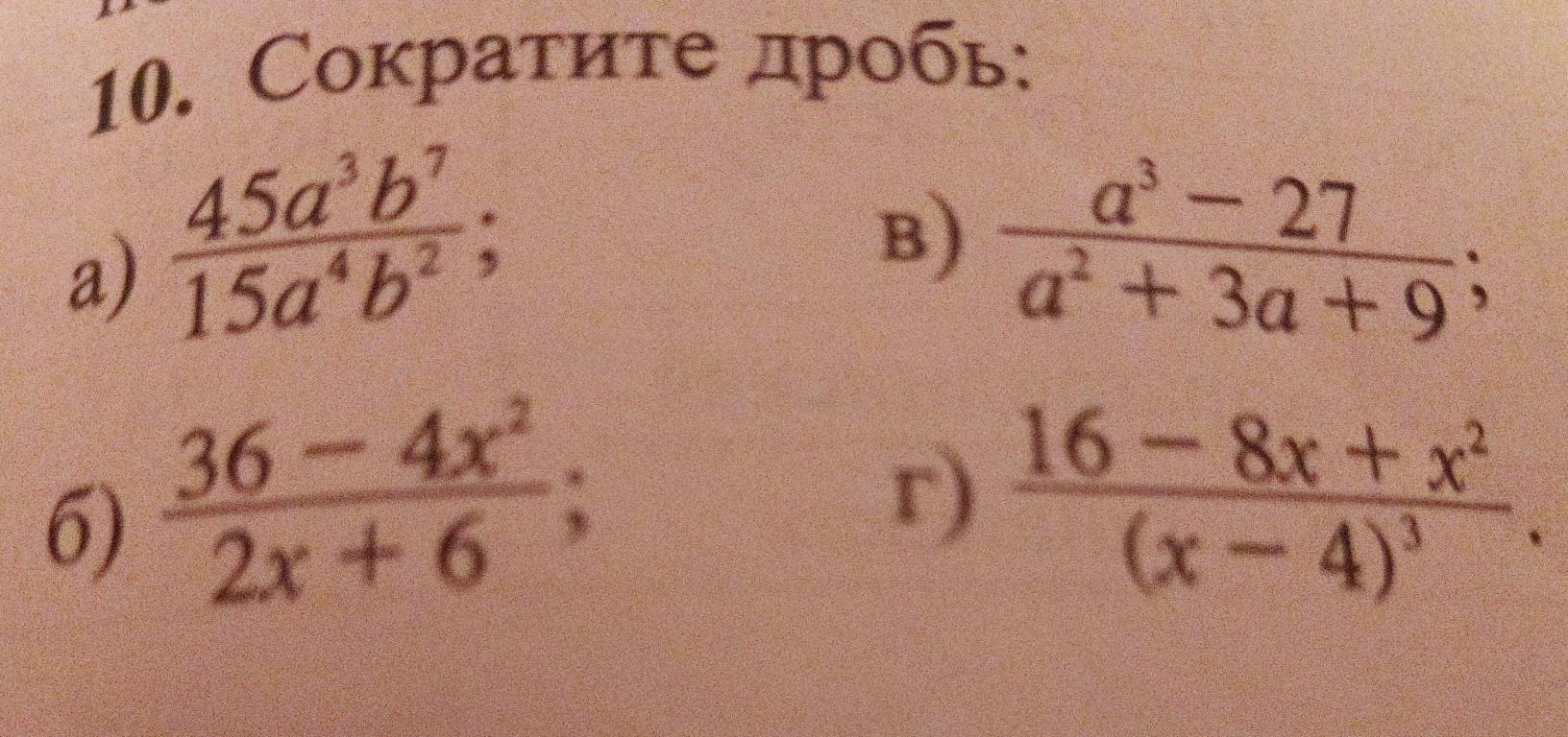 6) 10. Сократите дробь: 45a3b' a) 15a*b² ; 36-4x² 2x + 6 в) г) a3 - 27 a² + 3a + 9’ 16 - 8x + x² (x - 4)3