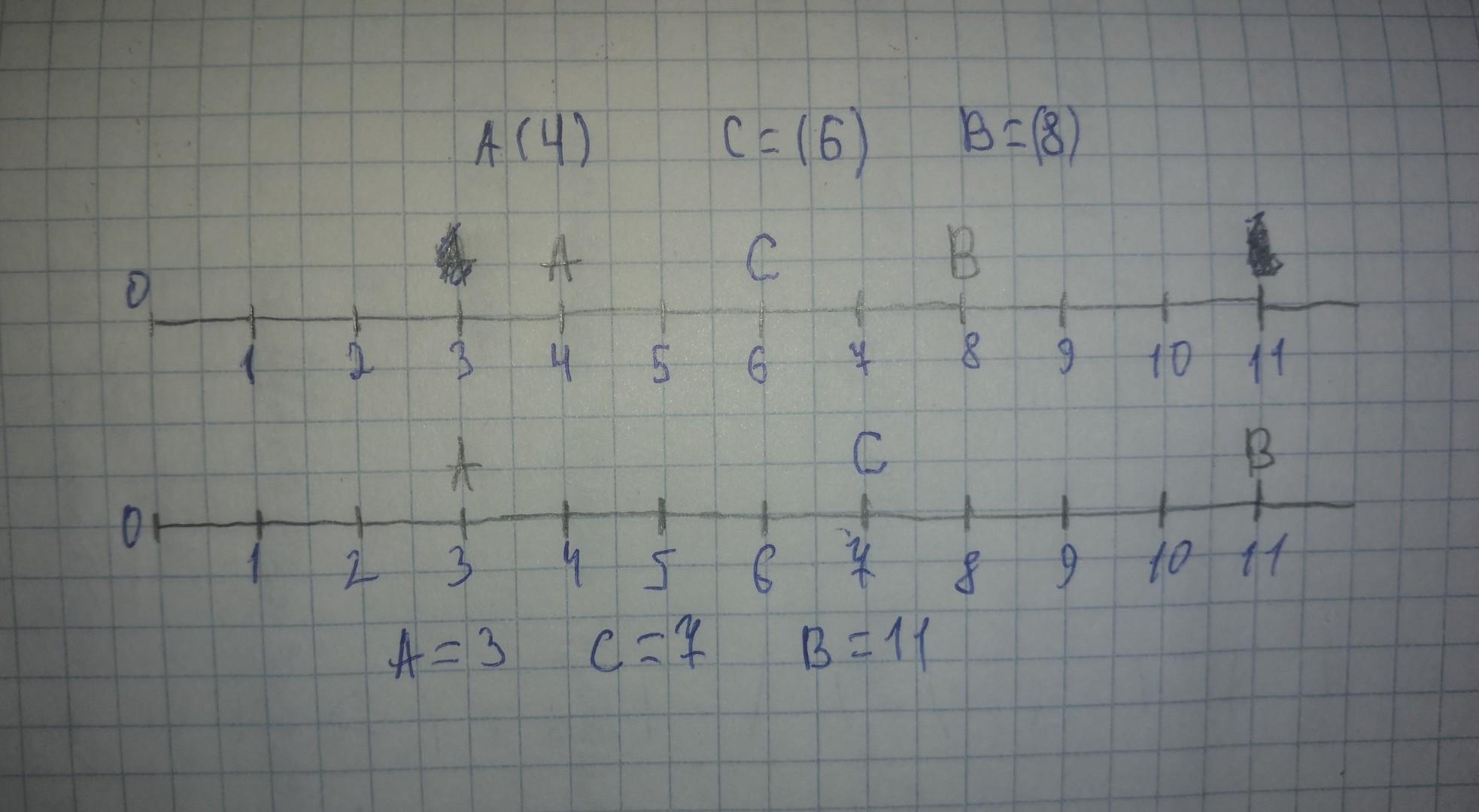 21. Бiрлiк кесiндiсi дәптердің 2 торкөзінің ұзындығына тең координаталык сәуле сызындар. Координаталык сәуле бойынан: 1) А(4) және В(8); 2) A(3) және В(11) нуктелерін белгілеп, АВ кесіндісiнiн как ортасындағы с нүктесiн координатасымен жазындар.