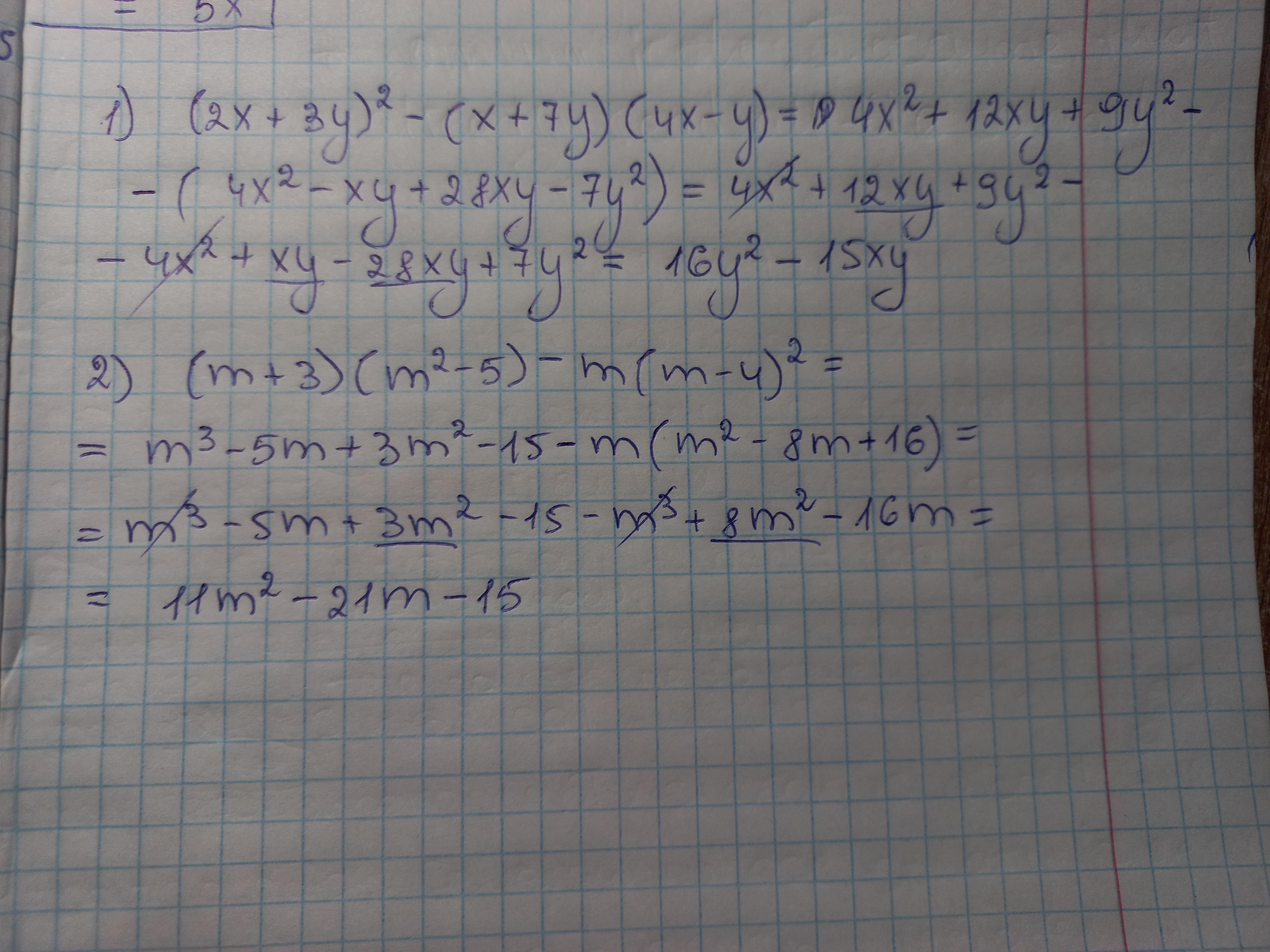 2) (m+3)(m²-5)-m(m-4)²=11m²-21m-15