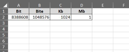 1)Перетворіть 8388608 біт в байти. Для цього в комірці В2введіть формулу: =А2/8