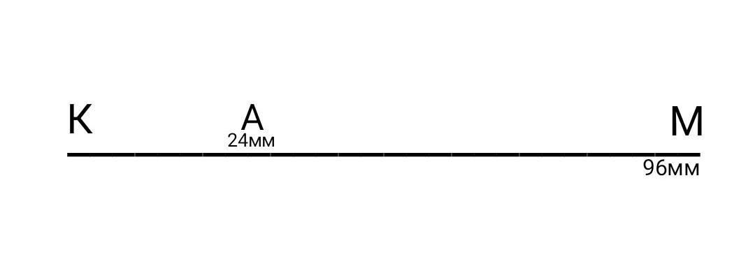 Накреслити вiдрiзок КМ завдовжки 96 мм. Позначити на ньому точку А, шоб довжина вiдрiзка КА дорівнювала 1/4 довжини вiдрiзка КМ.