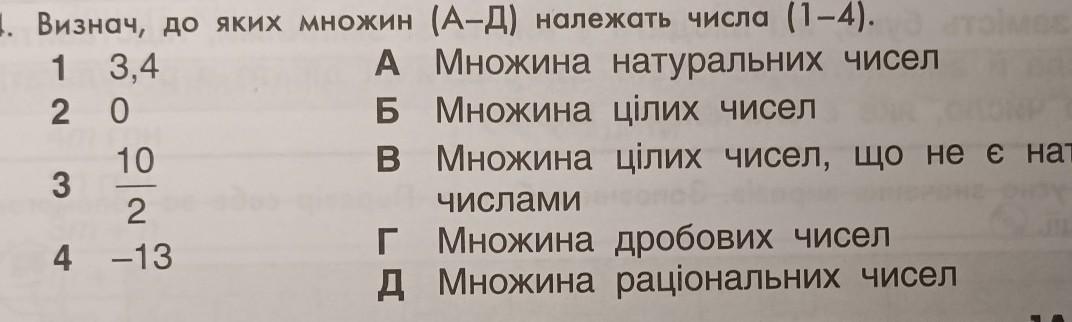 4. Визнач, до яких множин (А-Д) належать числа (1-4). 1 3,4 A Множина натуральних чисел Б Множина цілих чисел 20 В Множина цілих чисел, що не є натуральними 3 4 10 2 -13 числами Г Множина дробових чисел Д Множина раціональних чисел