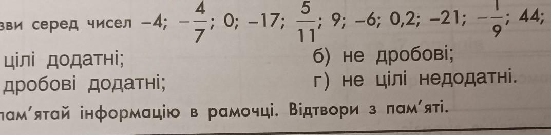 Назви серед чисел --4; --: 0; -17; 7 а) цiлi додатнi; в) дробові додатні; 0; -17; ; 9; -6; 0,2; -21; б) не дробові; г) не цiлi недодатні. 44; -50: