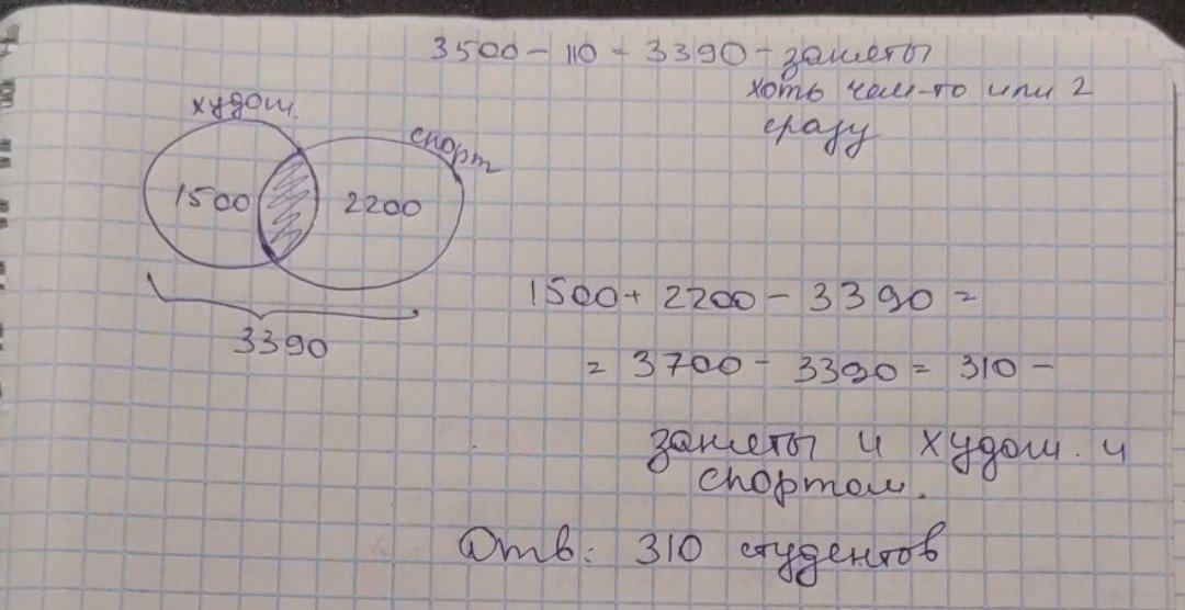 в університеті навчаетьсяя 3500 студентів. З них 1500 є учяасниками художньої самодіяльності, 2200 - члени спортиіних секцій. Ніде не задіяні 110 студентів. Визначити кількість студентів які є учасниками художньої самодіяльності та членами спортивних секцій