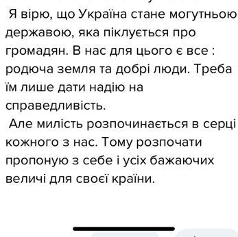 Ответ: Я бачу україну як рідну мати яка нас оберігає та дає нам життя на нашій землі яка була самим богом намічанна ним яка розцвітає як квітка на яку сонце падає та вона пє водиці , як цвітуть поля квіти і все інше