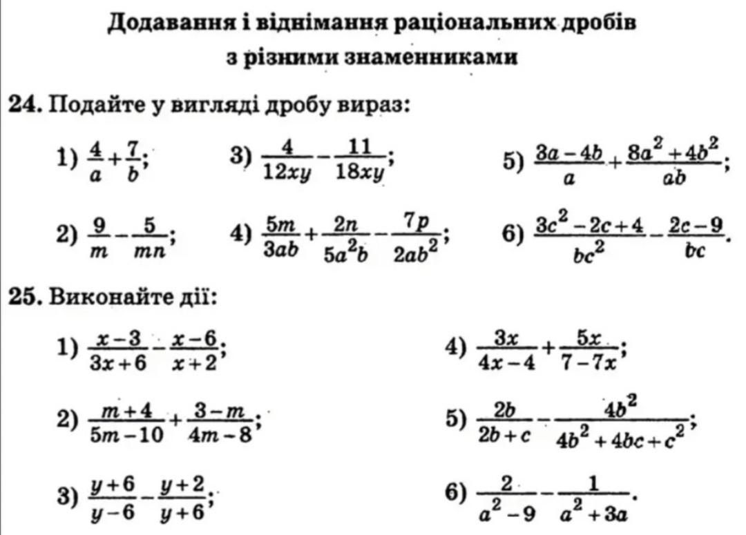 24. Подайте у вигляді дробу вираз: 4+7 7; 1) Додавання і віднімання раціональних дробів з різними знаменниками 2) 95. m mn 25. Виконайте дії: 1) _x-3-x-6. 3x+6 x+2' 2) 3) m + 4 5m-10 + - у+6 y+2. у-6 у+6’ 3) 3-m. 4m-8' 11 12xу 18ху 5m 4) + 2n 7р 3ab5a2ь 2ab2' - 4) 5) 6) 5) 6) 3a-4b+ Q 3c²-2c+4_2c-9 bc² 3x 5x + 4x-47-7x' 2. a2-9 8a2 + 402 ab 26 462 2b+c 462 +40c+ 1 . 2 a^+3a +C2 bc