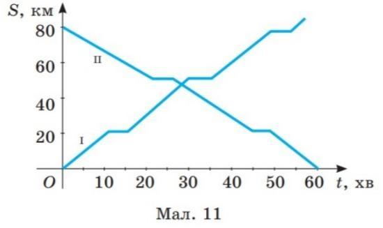 На малюнку 11 зображено графіки руху двох електропоїздів. Про- аналізуйте ці рухи: скільки зупинок робив кожен поїзд; коли вони зустрілися; скільки часу тривала кожна зупинка?