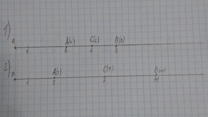 Б 21. Начертите координатный луч, приняв за единичный отрезок длину двух клеток тетради. На координатном луче отметьте точки: 1) А(4) и В(8); 2) A(3) и В(11). Отметьте точку С, являющуюся серединой отрезка АВ. Запишите точку С с координатой.