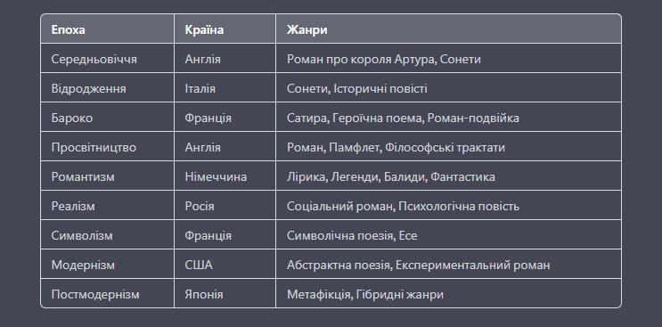 Складіть таблицю" Специфіка жанрів у різних національних літературах"( епоха- країна-жанри) срочно зарубижна