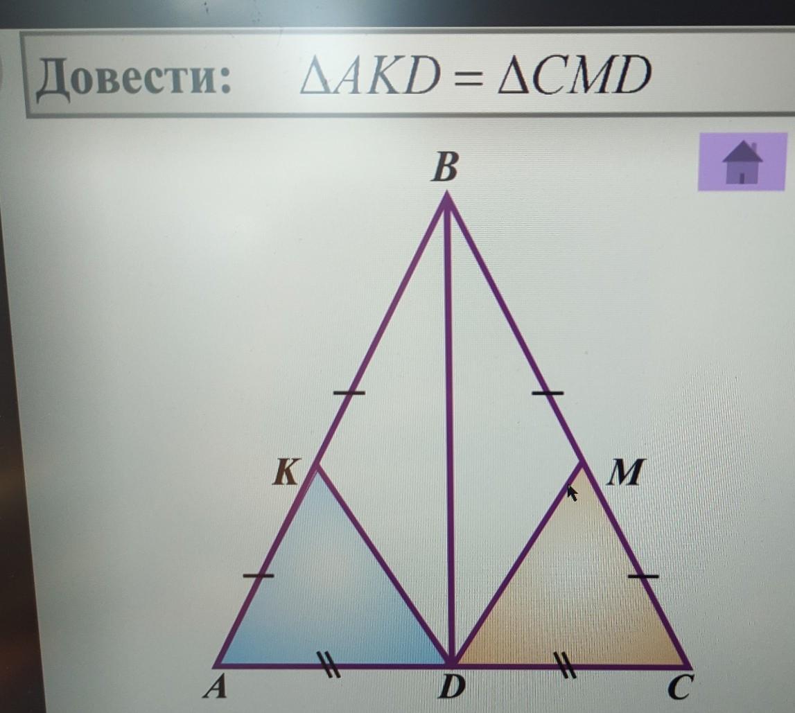 В такому випадку ∠А = ∠С . Це рівні кути ΔАКD i ΔCМD , у яких