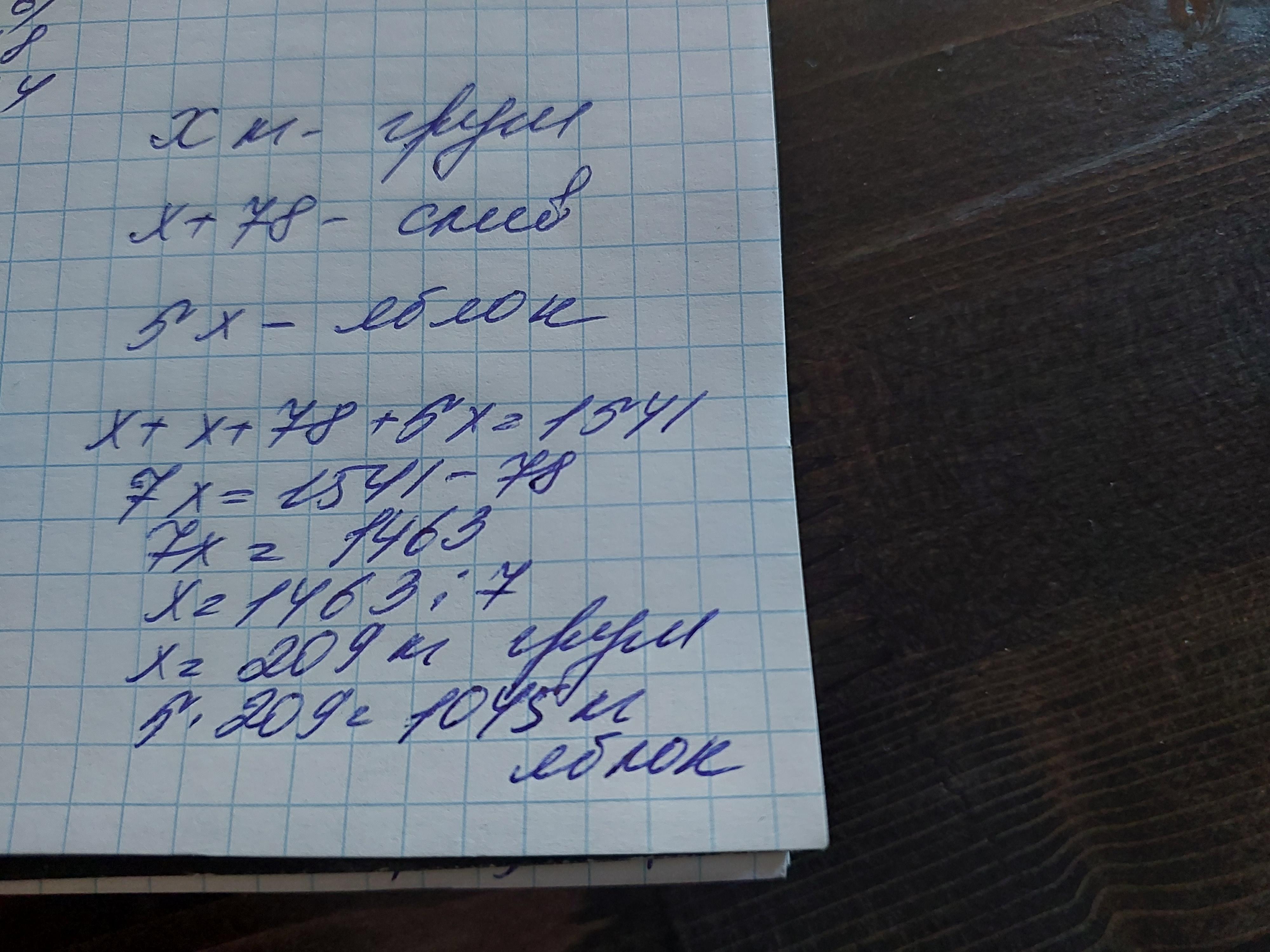 В магазин привезли 1541 кг фруктів. Яблук в 5 разів більше, ніж груш, а слив на 78 кг більше, ніж груш. Скільки кг яблук привезли?