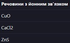 Речовини з йонним зв'язком: CuO, CaCl2, ZnS