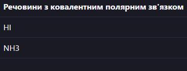 Речовини з ковалентним полярним зв'язком: HI, NH3