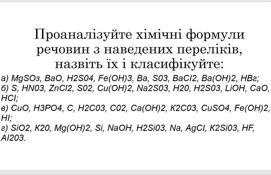 Проаналізуйте хімічні формули речовин з наведених переліків, назвіть їх і класифікуйте.Завдання на фото.